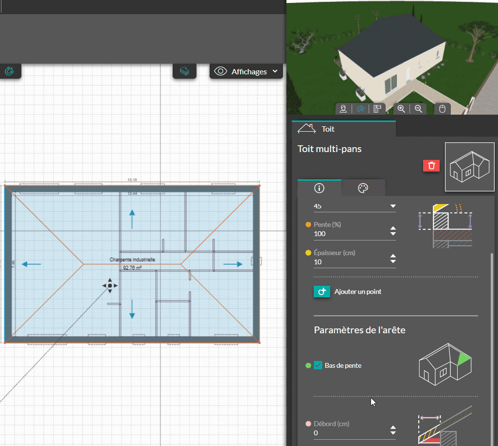 Toit multipans : Créer un bas de pente ou pignon en cochant/décochant respectivement la case “bas de pente”