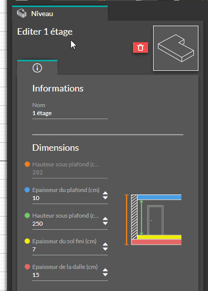 - Pour les plans de façade et les plans de coupe, assurez-vous de définir les différentes hauteurs de vos niveaux et/ou pièces (hauteur sous plafond, épaisseurs de dalle, sol fini et plafond...). Vous devez également représenter votre terrain naturel en dessinant ses différentes élévations.