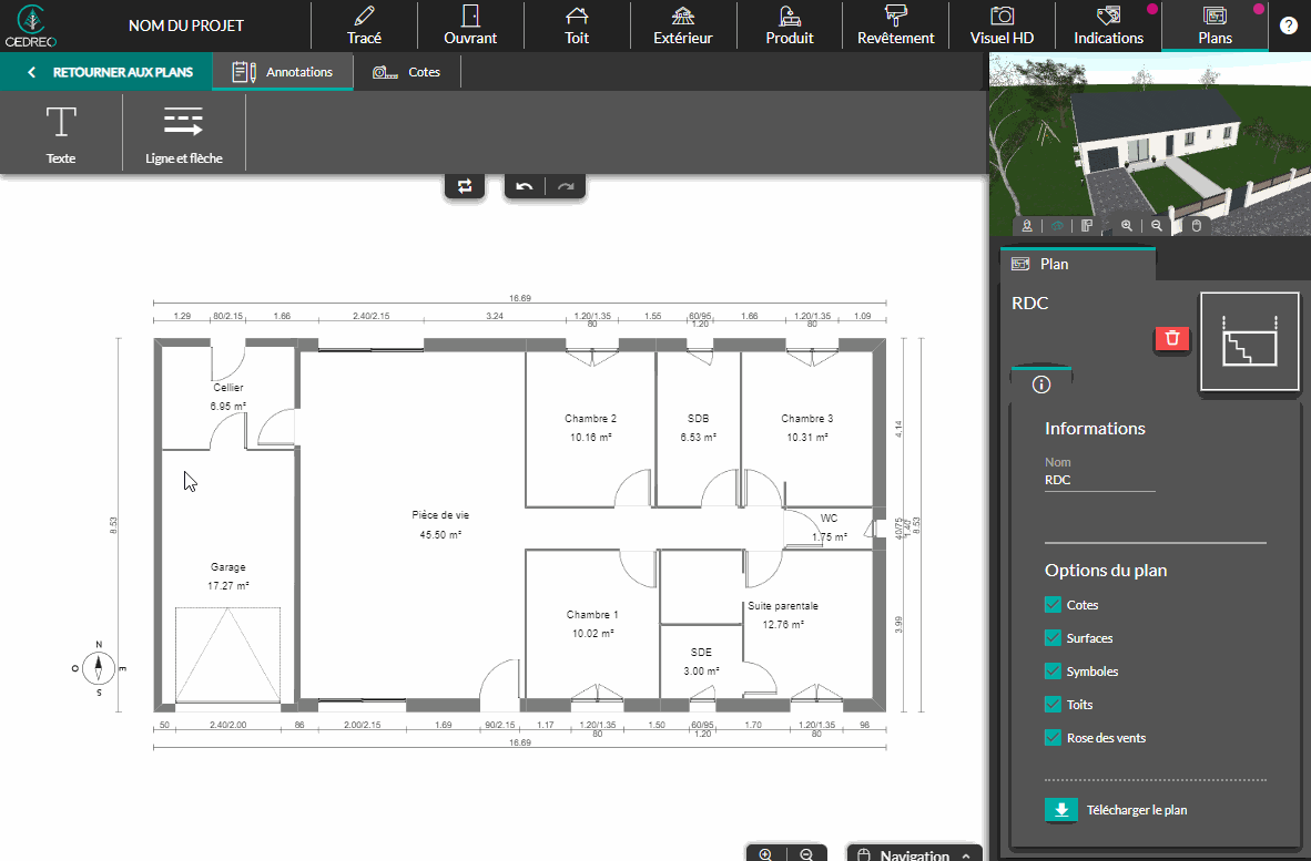Il est possible d'éditer de nombreux plans sur Cedreo : plans d'étage, de masse, de toit mais également plans de façade et de coupe.