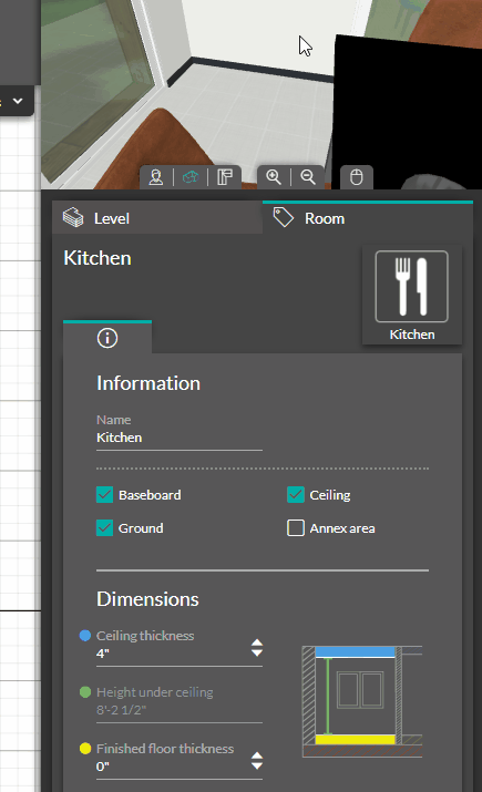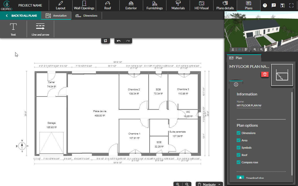 For each category, you'll have tools to annotate your plans (text and arrow) - for example, with the floor plan - and you can also customize your dimensions (wall-to-wall dimensions, free dimensions, elevation dimensions).